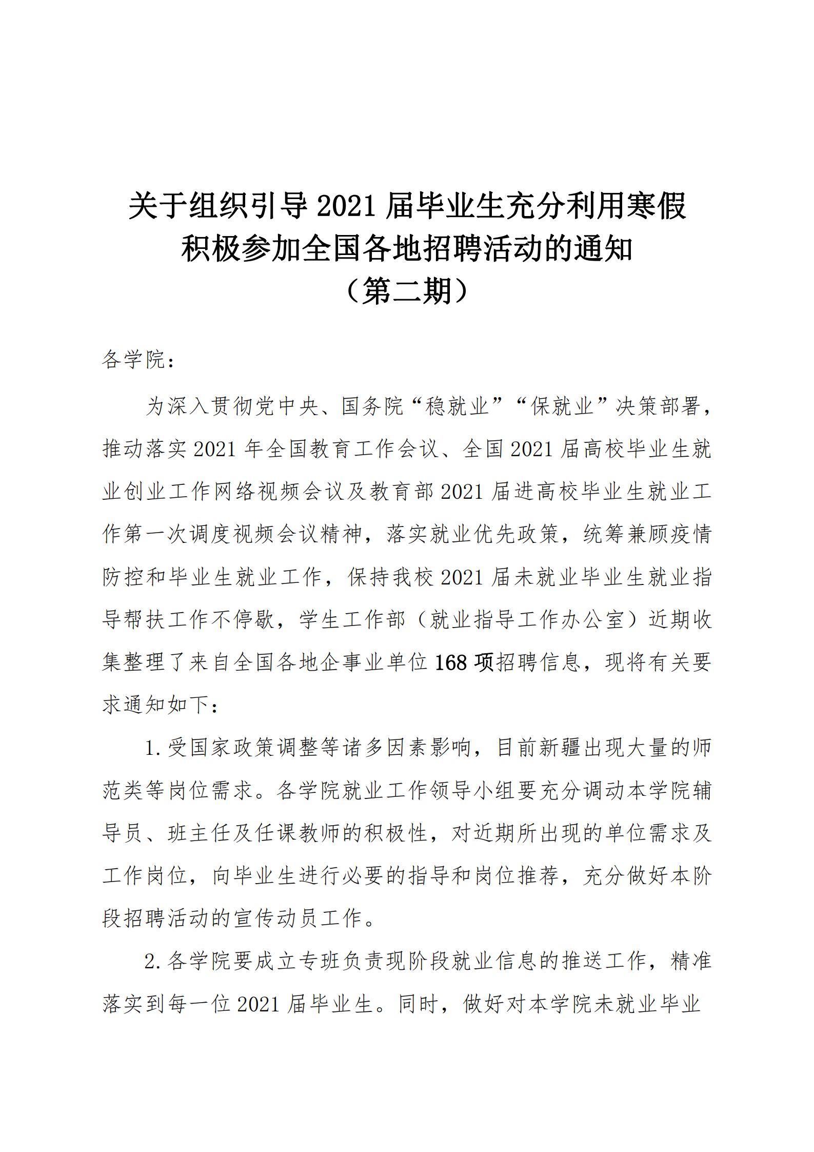 关于组织引导2021届毕业生充分利用寒假积极参加全国各地招聘活动的通知(第二期)