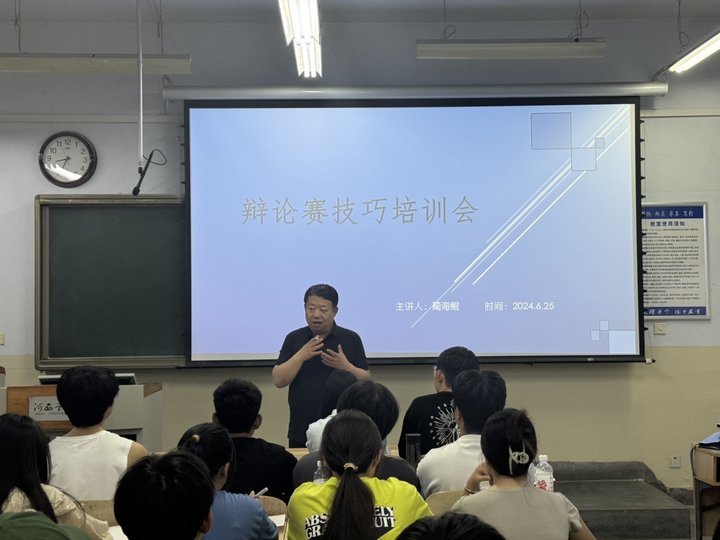 为进一步加强红足一1世足球网官方网站学生的司法口才训练,提高同学们的辩论能力。6月25日晚,学院邀请马克思主义学院蔺海鲲教授为辩论队员进行辩论赛技巧培训。培训重点是讲普通话、避免口头语、气息发声训练三方面,蔺海鲲教授向同学传授了运用气息提升声音穿透力技巧,指导了同学们在司法宣读时如何注意思维逻辑和语音表达清晰度。